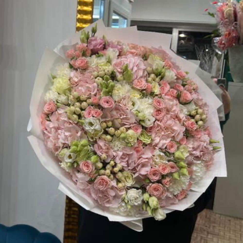 Lisianthus - 11 pcs bacche - 7 pcs garofano - 11 pcs ortensie rosa - 9 pcs roselline - 11 pcs