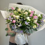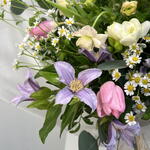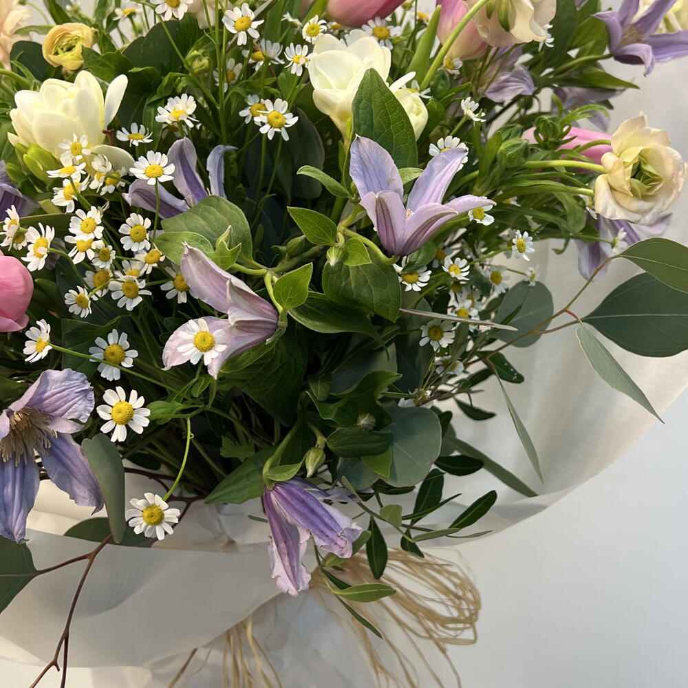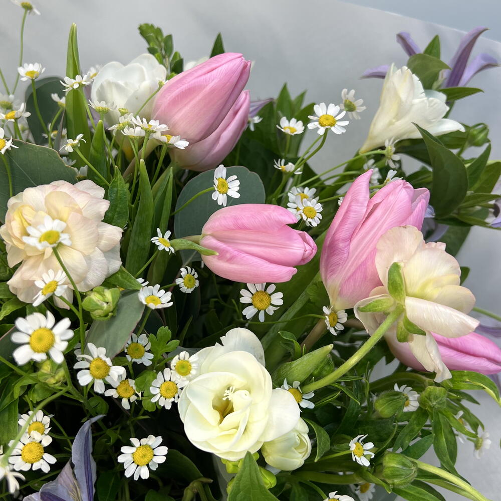 Greenery - 5 pcs Tulips - 8 pcs Freesia - 5 pcs Clematis - 1 pcs chamomile - 9 pcs ranunculus - 5 pcs