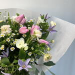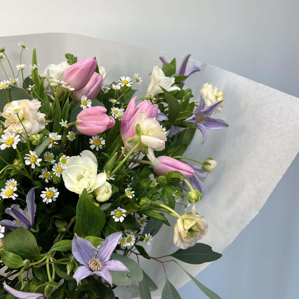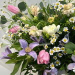 Experience pure freshness: delicate chamomile meets colourful tulips and elegant ranunculus. Delicate clematis adds a romantic touch to the arrangement, while the subtle scent of freesia brings spring right into your home. A relaxed, natural bouquet for any occasion.