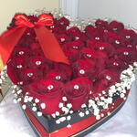 Heart shaped box overflowing with our premium freedom roses. Choice of Box color varies upon availability ( Black , Red or Pink ) (24-26 roses approx.)