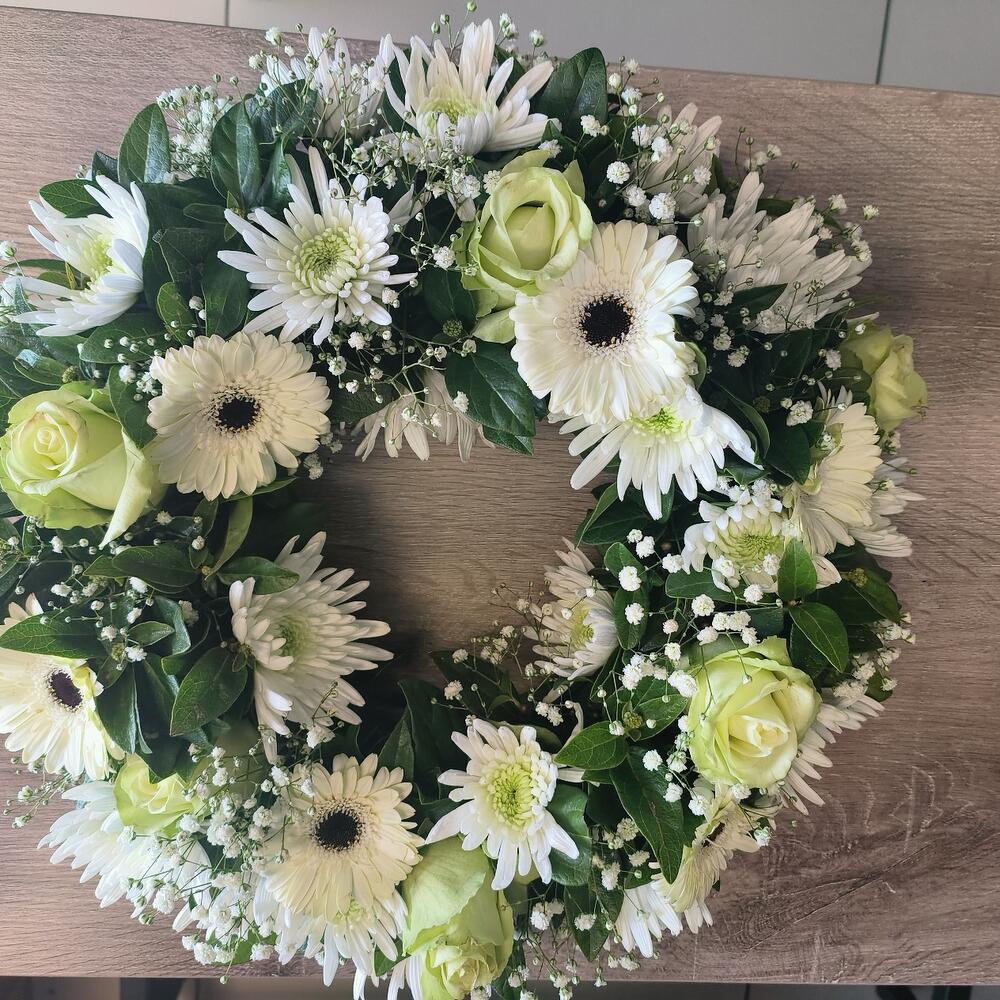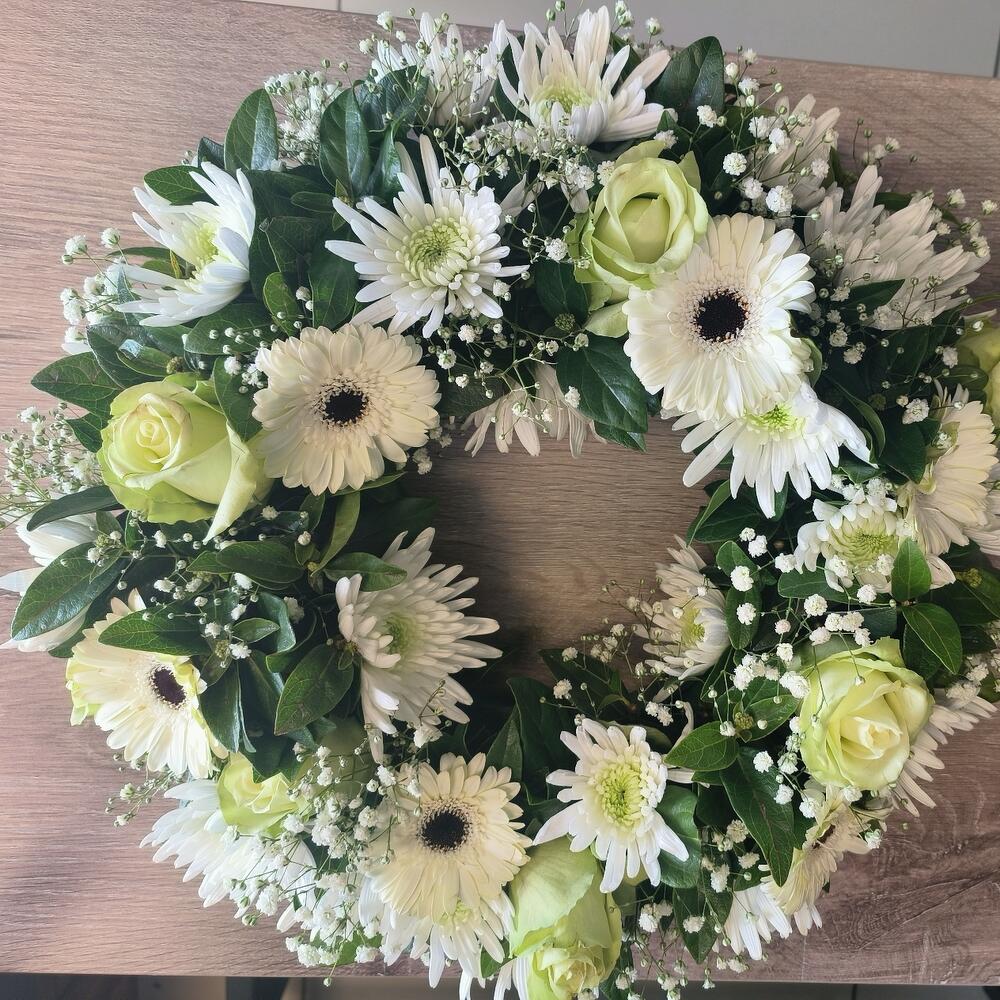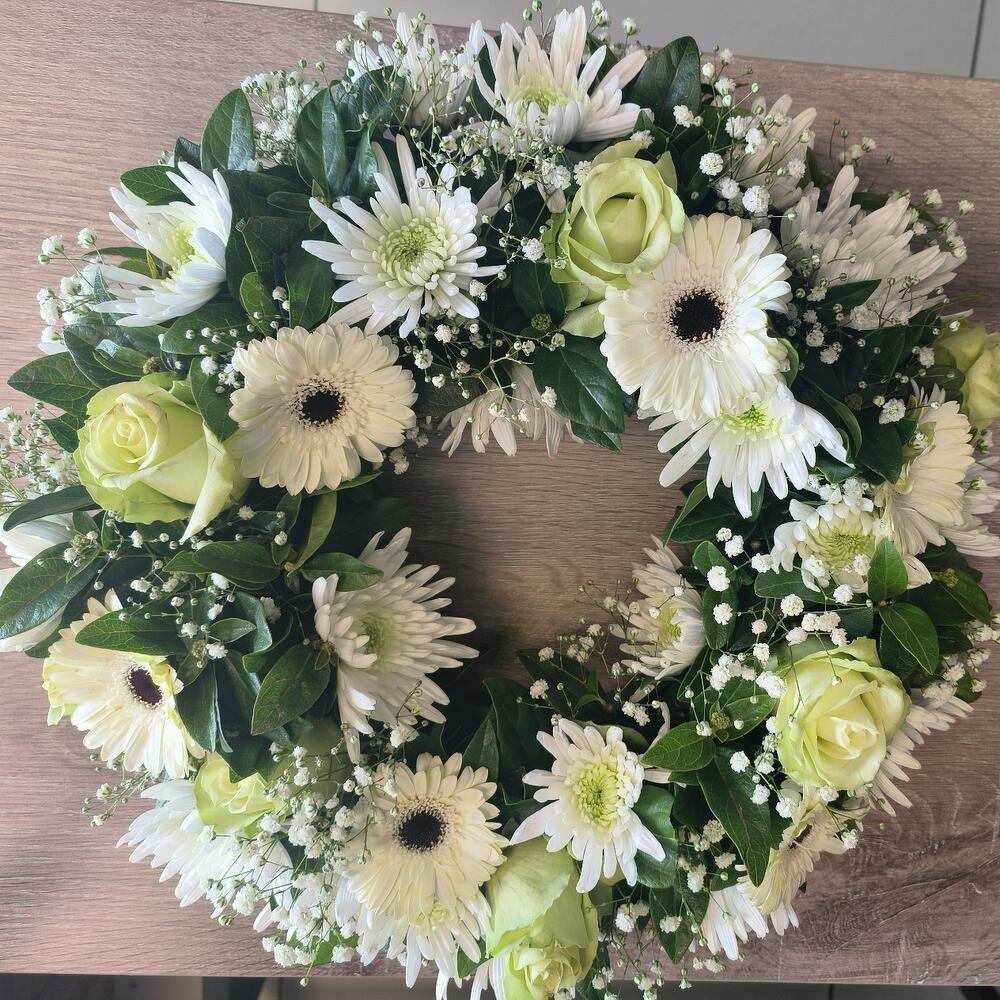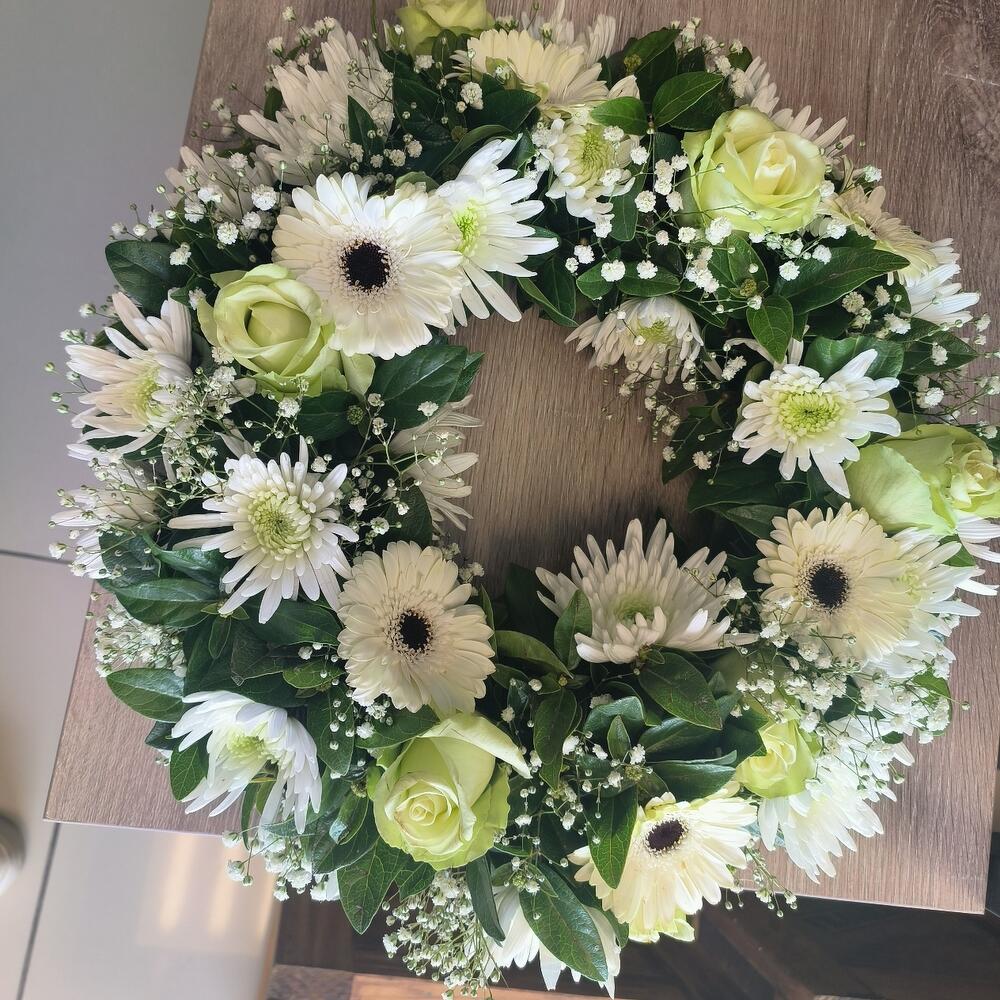 Gypsophila - 2 pcs white roses - 6 pcs white chrysenthemums - 5 pcs virbanum (green) - 4 pcs white gergeras - 6 pcs