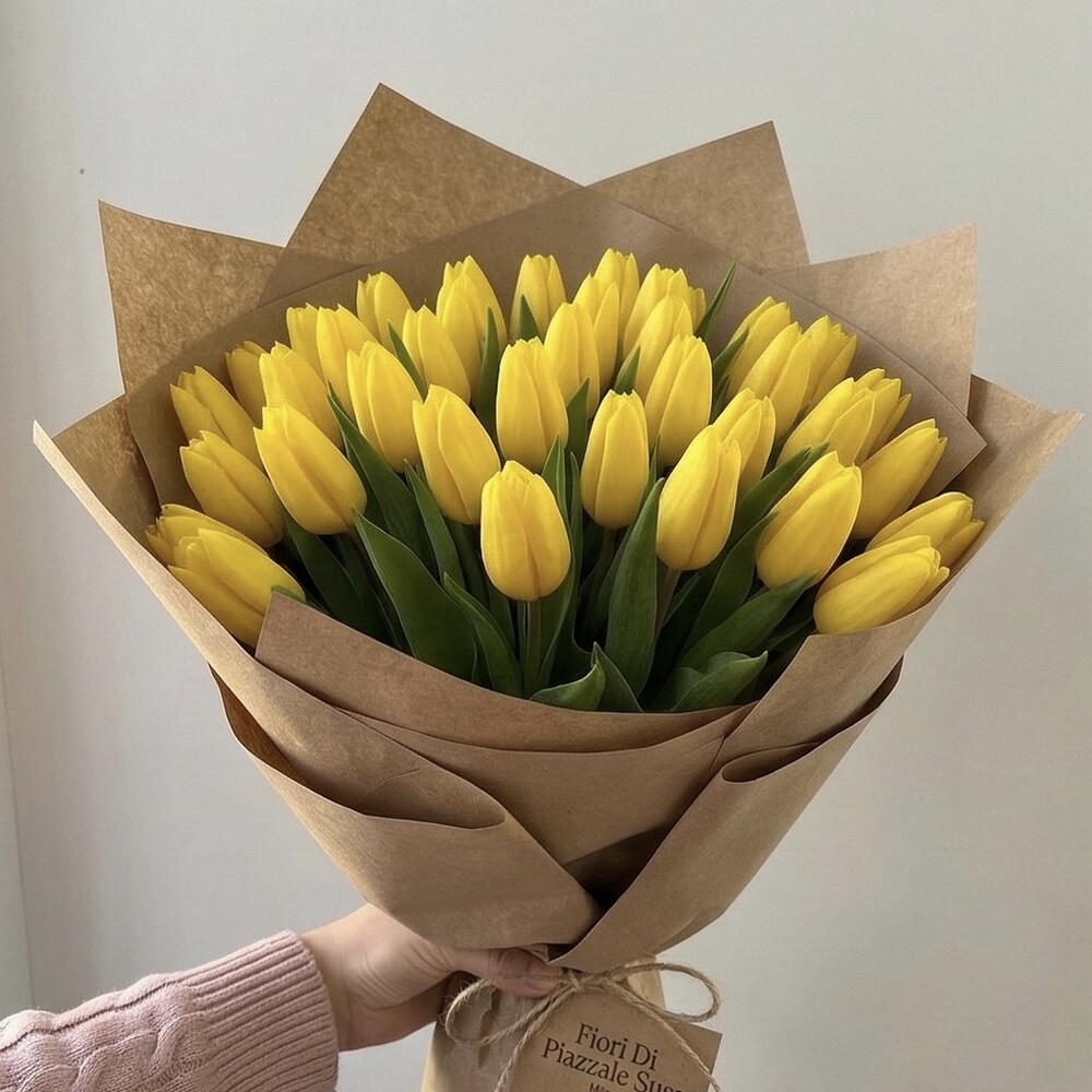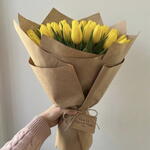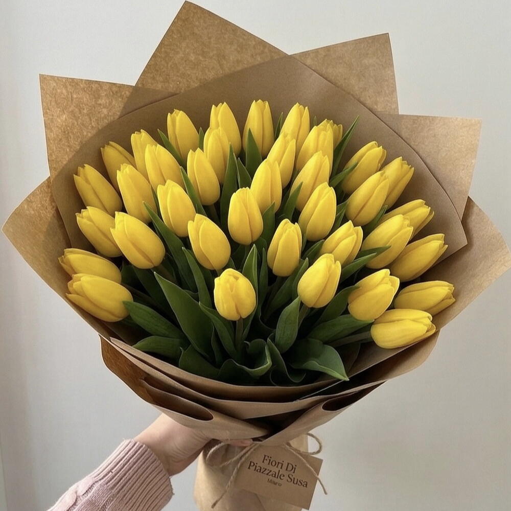 40pcs fresh yellow tulips wrapped in eco-friendly brown craft paper tied with eco-friendly twine.