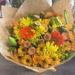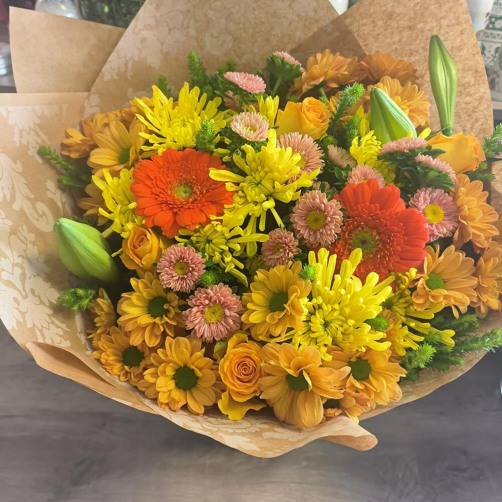 A beautiful bouquet made of a selection of yellow and orange flowers. Orange roses, orange gerberas, yellow and orange chrysenthemums
