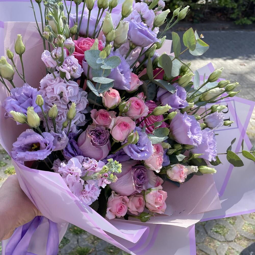 eucalyptus cineria - 3 pcs pink - 7 pcs levkoi - 3 pcs spray rose mix - 3 pcs lisianthus lavender - 5 pcs