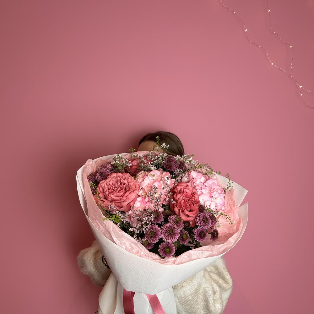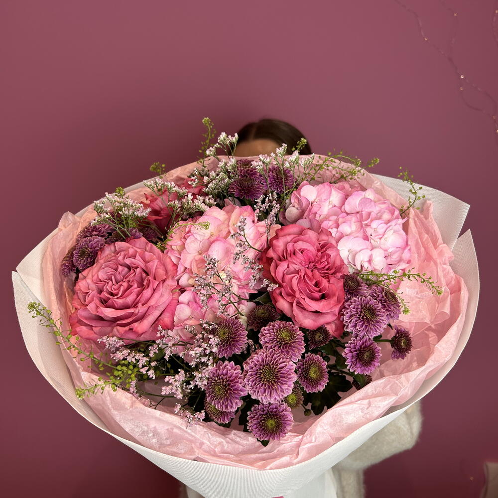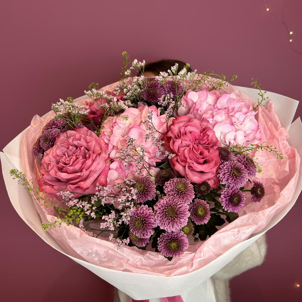 Limonium - 1 pcs santini - 4 pcs aquabox - 1 pcs pink hydrangea - 2 pcs decorative paper - 1 pcs roses country blues - 3 pcs