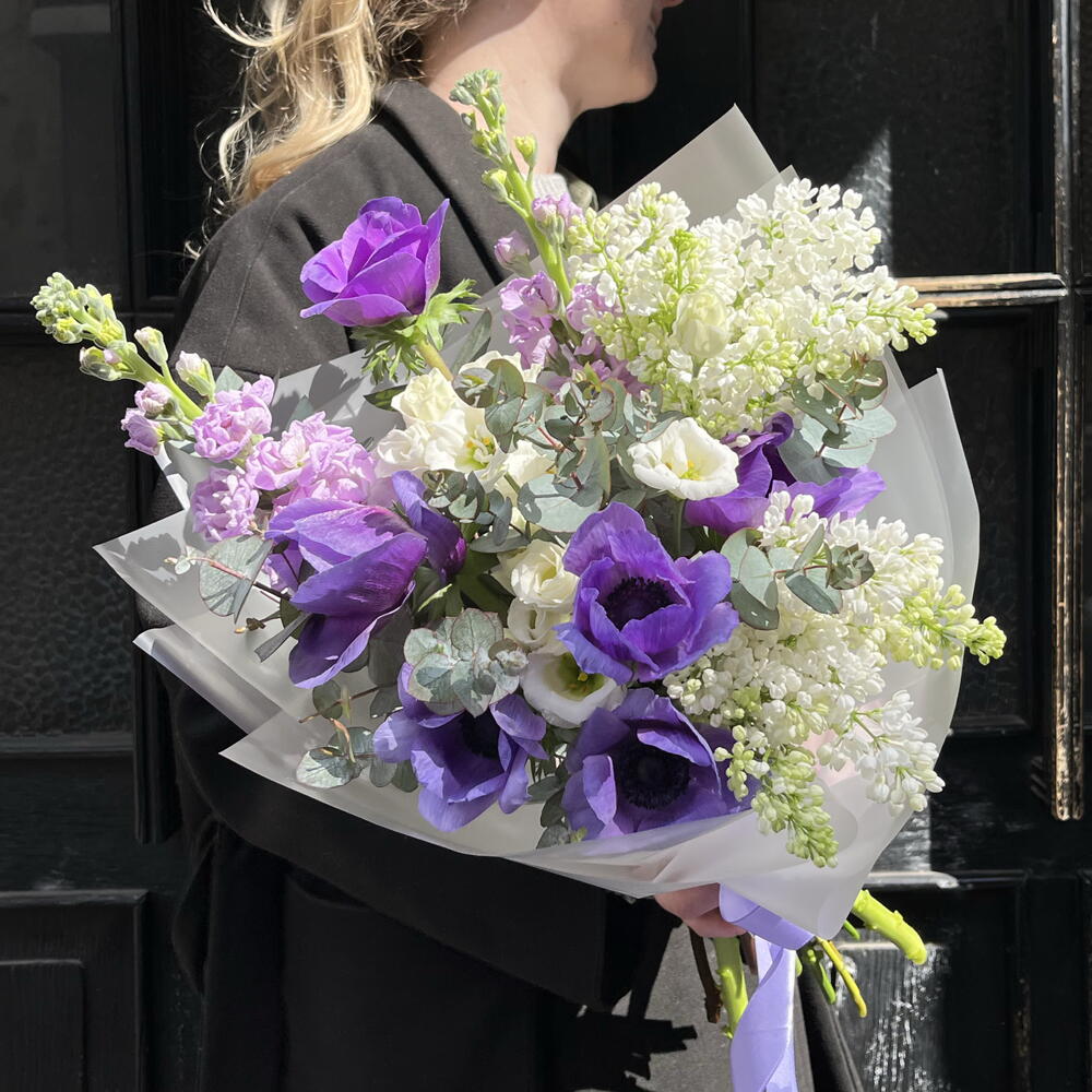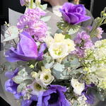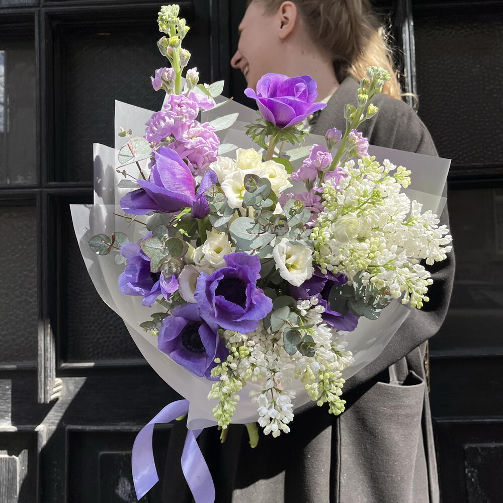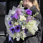 Eustoma - 2 pcs Eucalyptus - 3 pcs Anemone - 6 pcs Lilac - 2 pcs matthiola - 2 pcs designer wrapping - 1 pcs