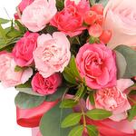 rose bush - 3 pcs carnation - 3 pcs satin bow - 1 pcs raffaello 150g - 1 pcs decorative greenery - 10 pcs hat box - 1 pcs