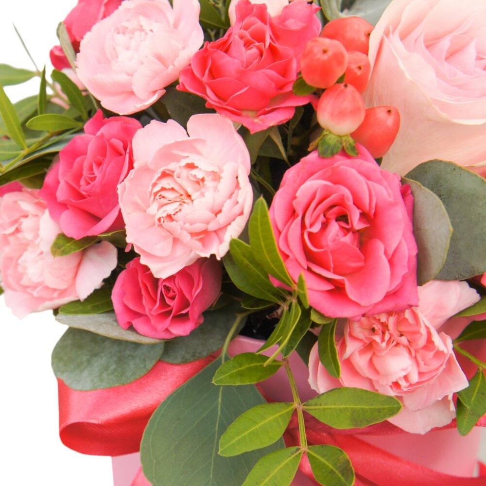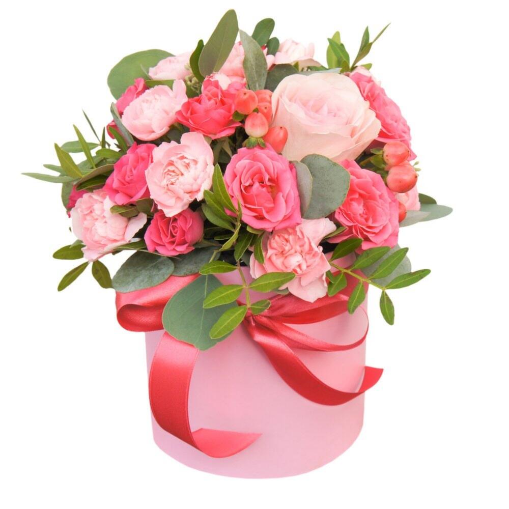 rose bush - 3 pcs carnation - 3 pcs satin bow - 1 pcs raffaello 150g - 1 pcs decorative greenery - 10 pcs hat box - 1 pcs