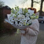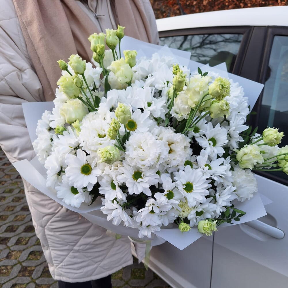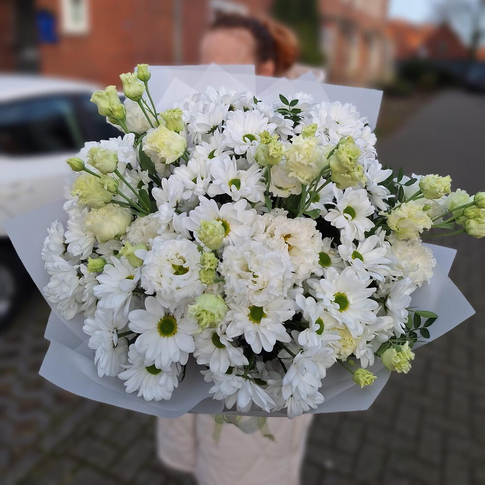 Eucalyptus - 2 pcs lisianthus white - 5 pcs chrisantemus - 8 pcs