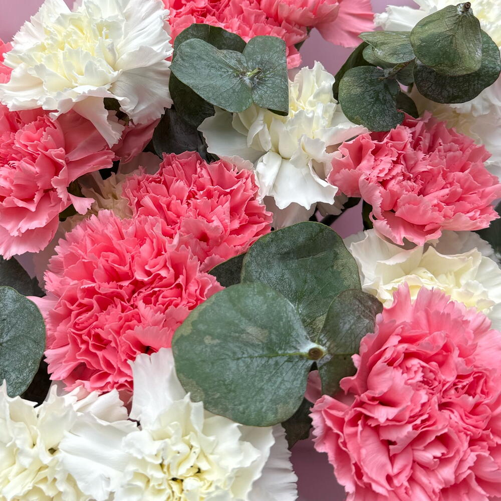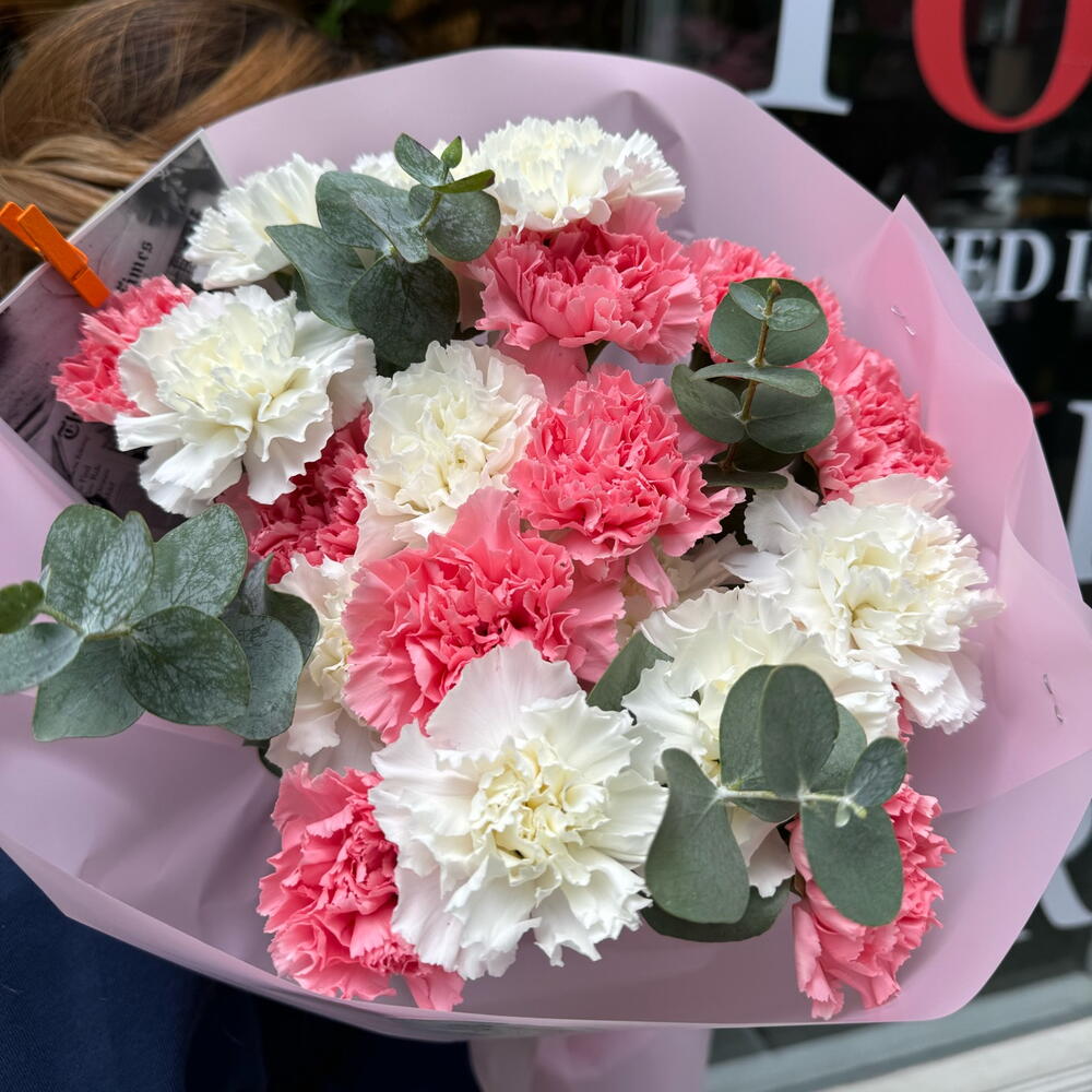 Eucalyptus - 5 pcs dianthuses pink - 10 pcs dianthuses white - 11 pcs