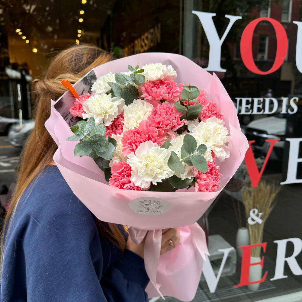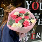 This refined bouquet combines delicate shades of dianthuses and the aroma of eucalyptus. Together with the original designer packaging, this bouquet will be a wonderful gift for any occasion - from a romantic evening to a holiday event. it will fill the room with freshness and tenderness, giving joy and peace to its owner. Add to favorite to not lose! HOW TO CARE OF FLOWERS? Do not remove the wrapping paper from the bouquet, so then flowers will live longer Change the cold water in a vase every day Keep the vase clean Cut the stem of each flower every two days Keep the bouquet out of a direct sun, drafts and heaters Add the flower food 2-3 days after you’ve bought your bouquet (We add the flower food to every bouquet)