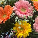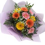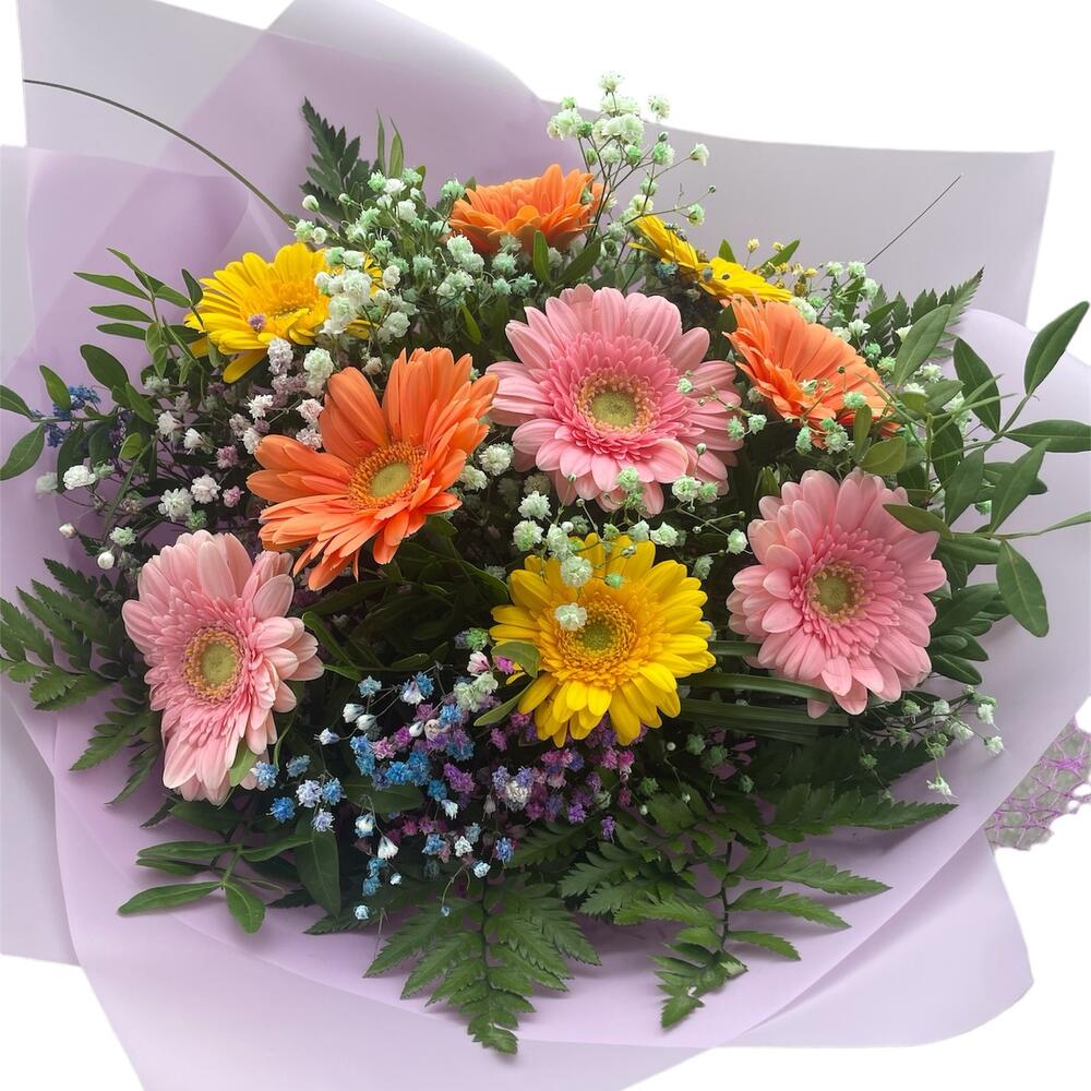 Charming colourful buquet of mini gerberas in postel colours with added coloured gypsophila touch . Wraped in a luxury paper wrap with ribbon.