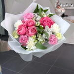 Alstroemeria - 3 pcs rose - 1 pcs carnation - 6 pcs spray carnations - 3 pcs packaging - 1 pcs ribbon - 1 pcs peony-shaped spray rose - 1 pcs