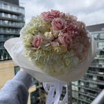 carnations - 3 pcs hydrangeas - 3 pcs pink roses - 3 pcs white spray roses - 1 pcs
