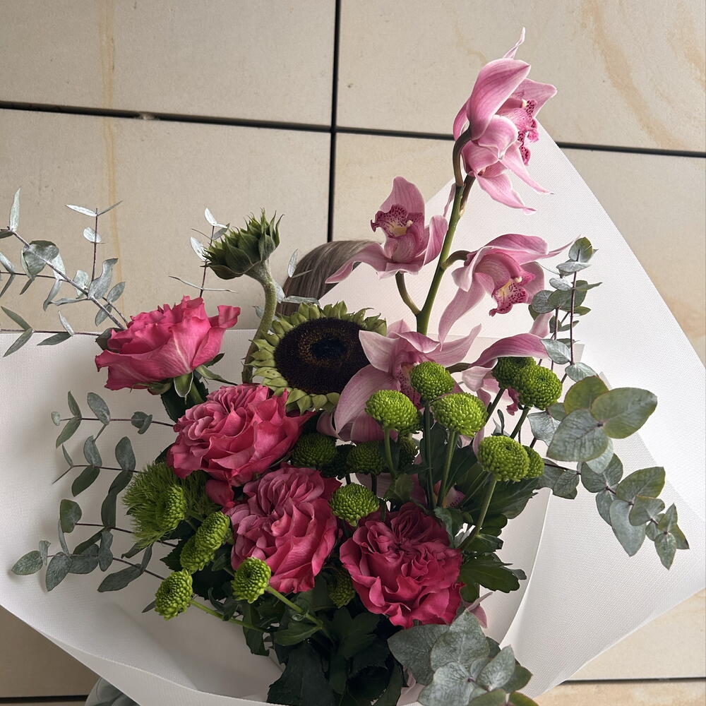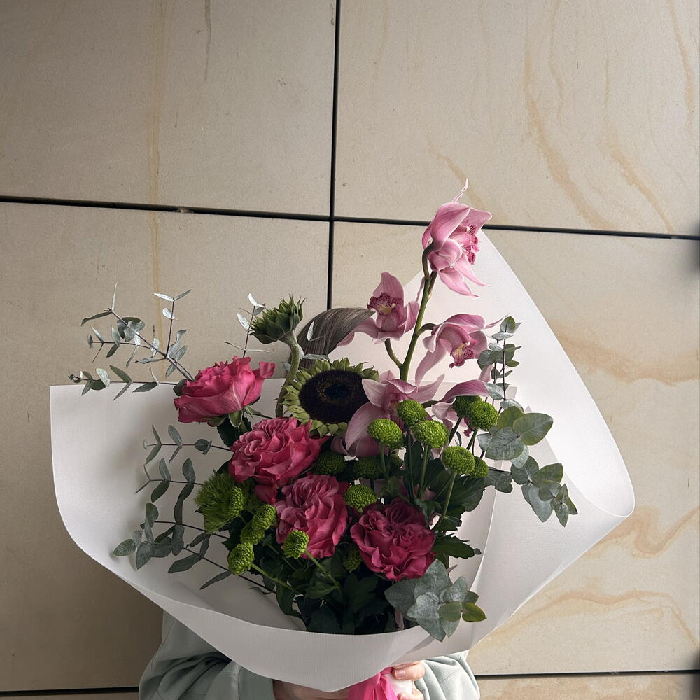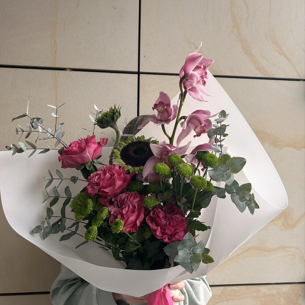 Eucalyptus - 2 pcs santini - 3 pcs cymbidium - 1 pcs aquabox - 1 pcs carnations - 1 pcs roses - 4 pcs decorative paper - 1 pcs sunflowers - 2 pcs