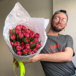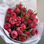 Indulge in the timeless beauty of this Mono Bouquet, lovingly handcrafted with 25 vibrant tulips. Each flower is nestled in delicate paper, showcasing their radiance and charm. This bouquet truly captures the spirit of elegance, making it a perfect gift for any occasion or a breathtaking centerpiece for your home. Experience the joy of giving or receiving this sublime collection of natures finest blooms.