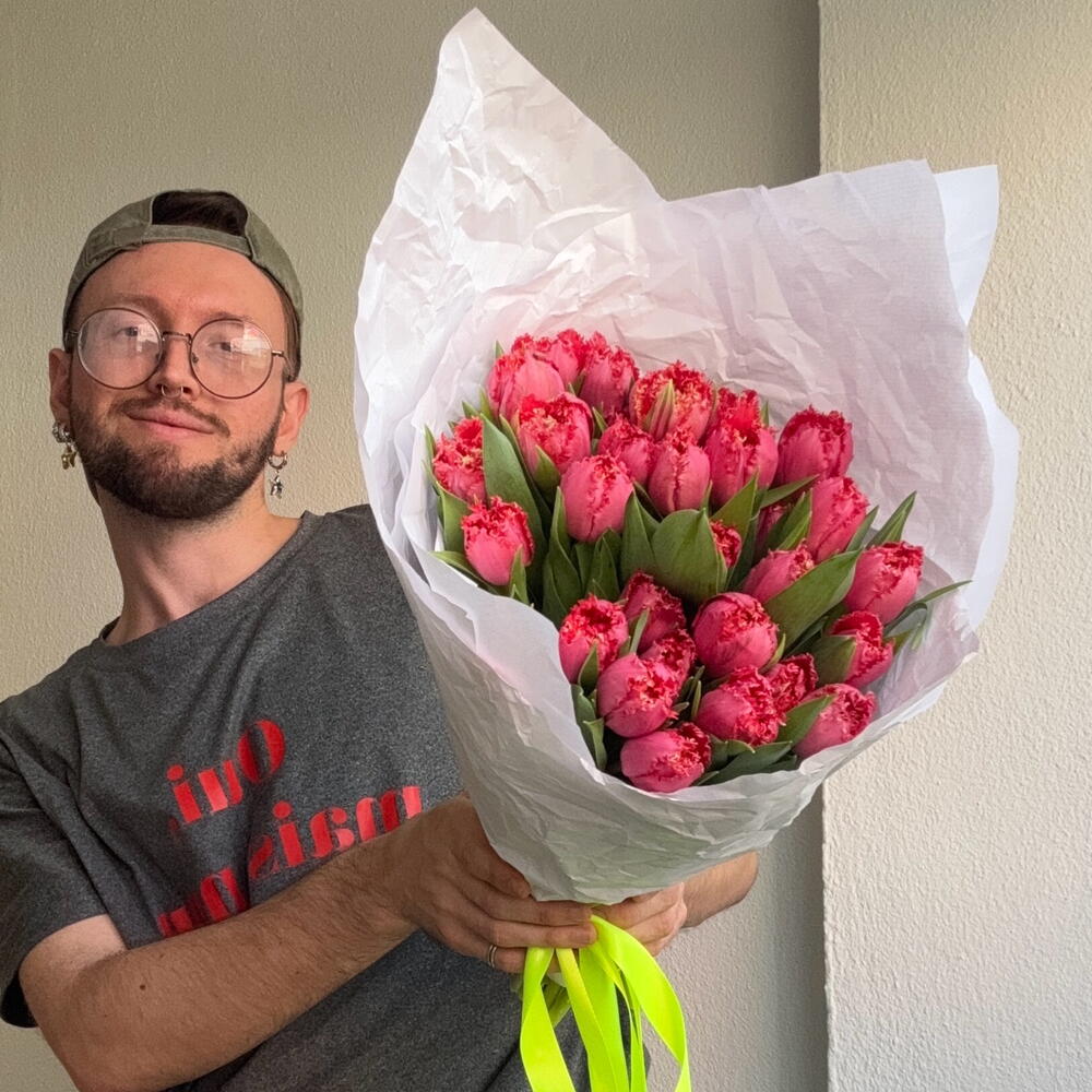Indulge in the timeless beauty of this Mono Bouquet, lovingly handcrafted with 25 vibrant tulips. Each flower is nestled in delicate paper, showcasing their radiance and charm. This bouquet truly captures the spirit of elegance, making it a perfect gift for any occasion or a breathtaking centerpiece for your home. Experience the joy of giving or receiving this sublime collection of natures finest blooms.