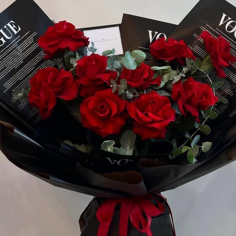 Ribbon - 1 pcs Eucalyptus - 5 pcs paper - 6 pcs roses - 9 pcs