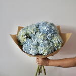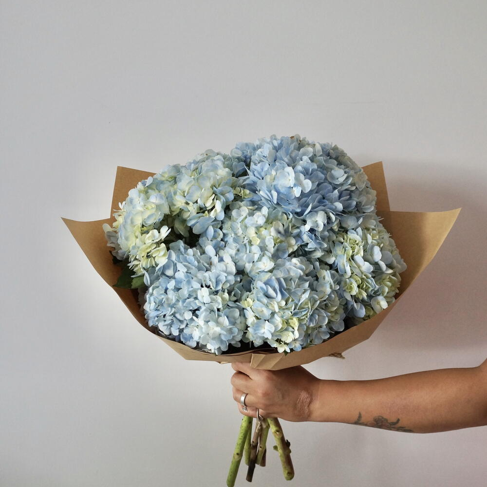 Monobouquet of Hydrangeas in Kraft Paper The flower color can be blue, pink or white, depending on stock.