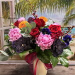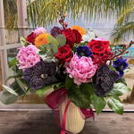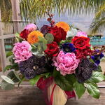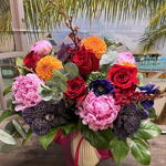 A vibrant and luxurious arrangement combines exotic tropical elements with classic floral favorites, creating a visually stunning display perfect for special occasions or as a statement piece.