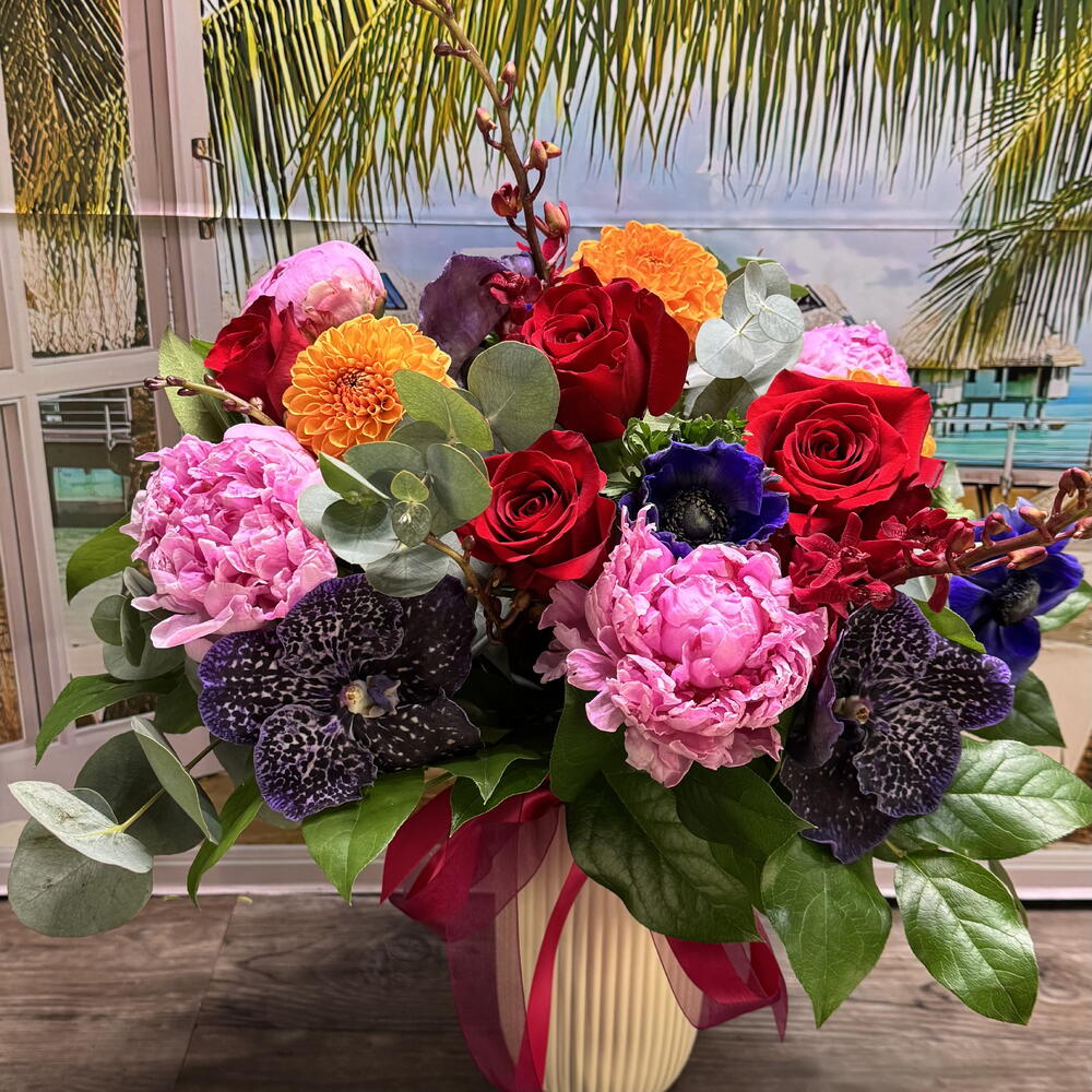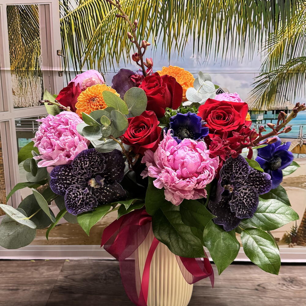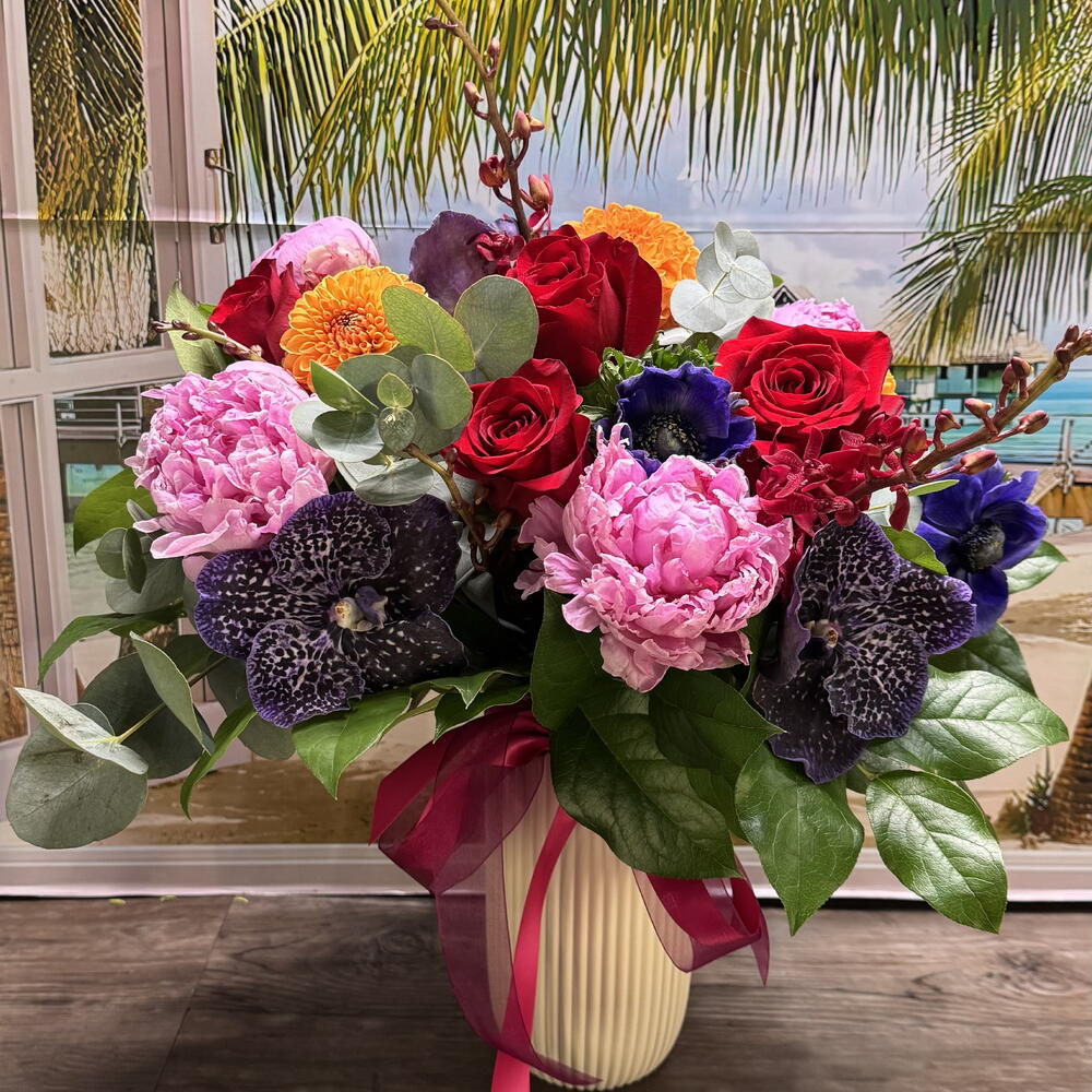 Anemone - 3 pcs Peonies - 4 pcs dahlia or chrysanthemum - 3 pcs vanda orchids - 3 pcs roses - 4 pcs eucalyptus and lemon leaves - 4 pcs mokara orchids - 2 pcs
