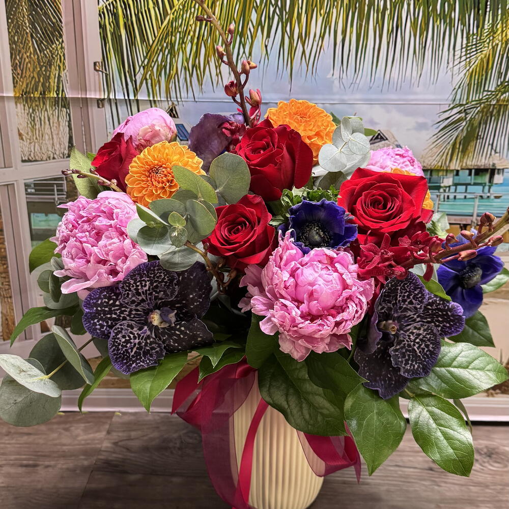 A vibrant and luxurious arrangement combines exotic tropical elements with classic floral favorites, creating a visually stunning display perfect for special occasions or as a statement piece.