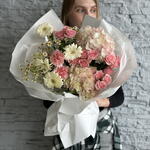 Hydrangea - 2 pcs Gerbera - 4 pcs pink carnations - 3 pcs camomile - 3 pcs spray roses - 3 pcs