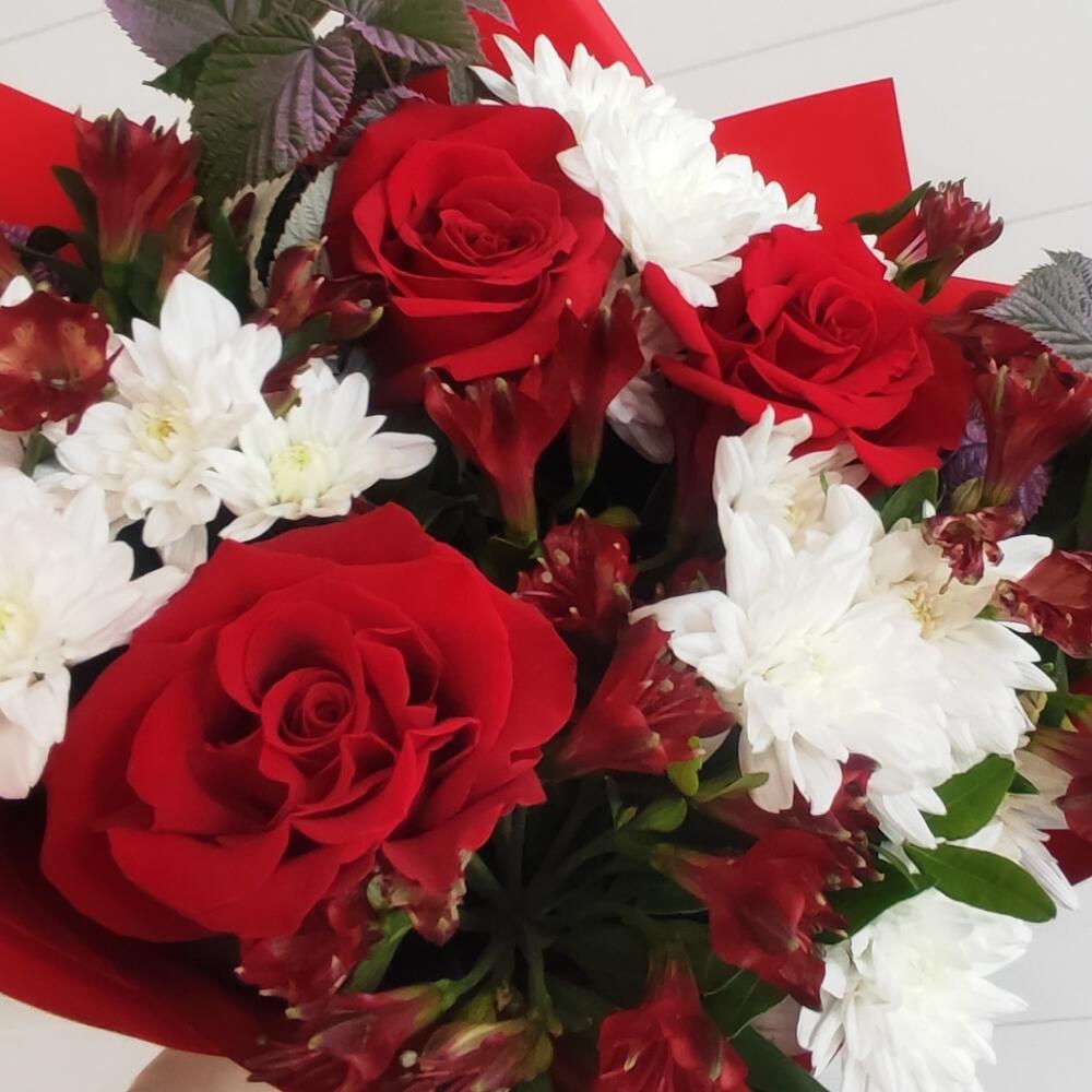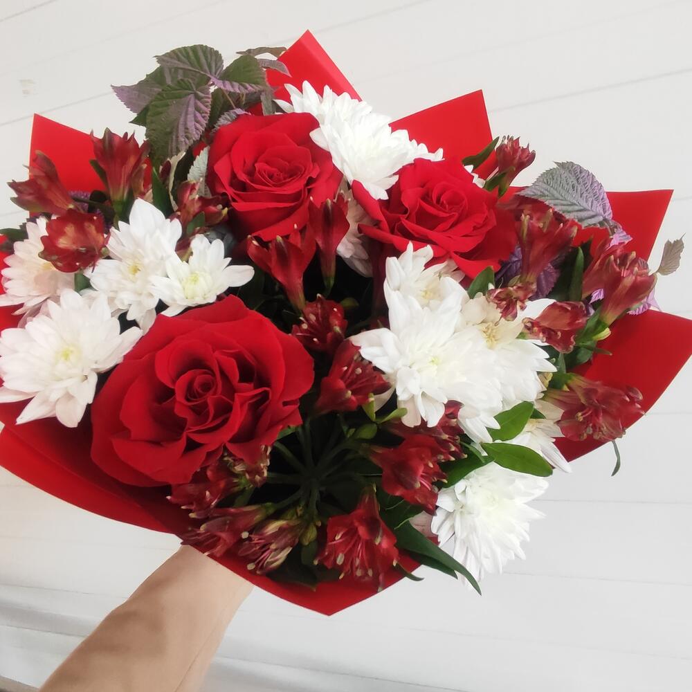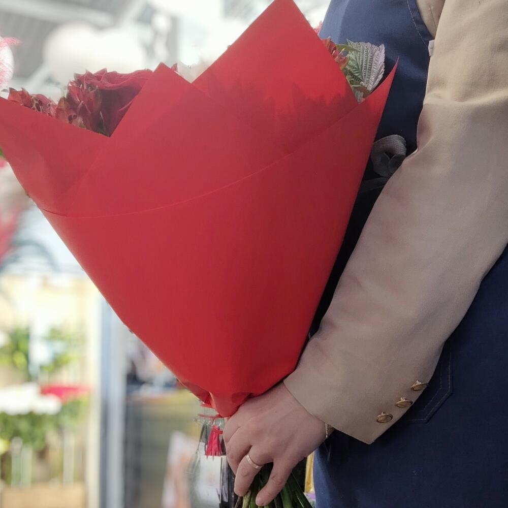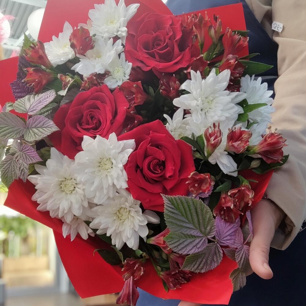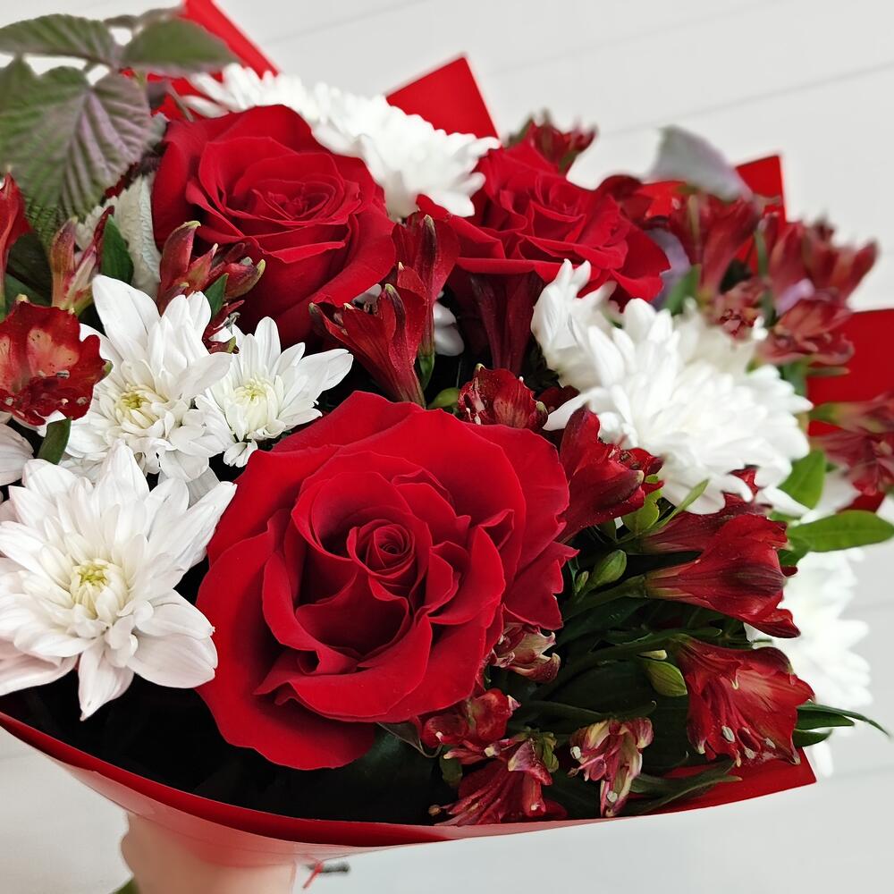 Chrysanthemum - 3 pcs Alstroemeria - 5 pcs rose red - 3 pcs decorative greenery - 2 pcs paber - 2 pcs