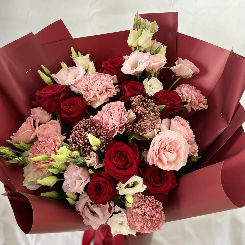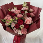 Lisianthus - 2 pcs eucalyptus cineria - 2 pcs dianthus pink - 5 pcs rose spray - 3 pcs rosa red naomi - 7 pcs