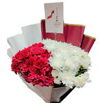 White and maroon chrysanthemum aramged in a maroon and white papers