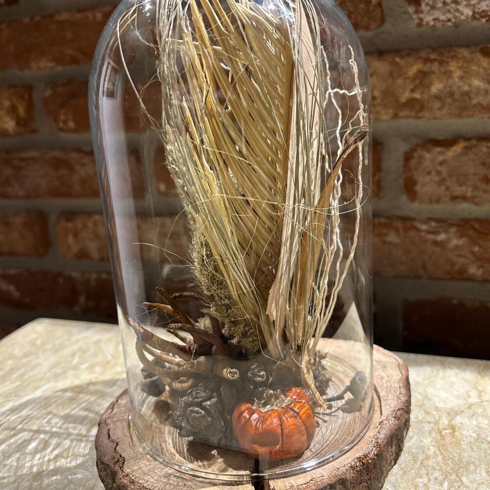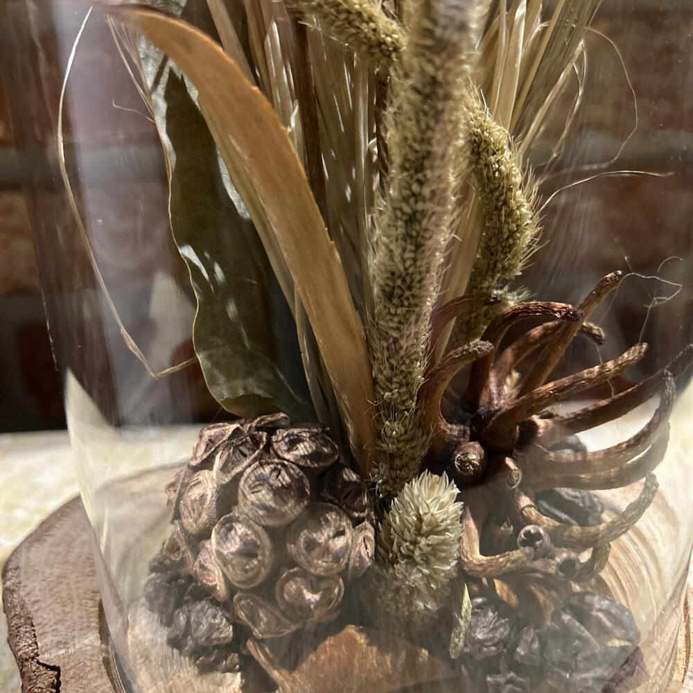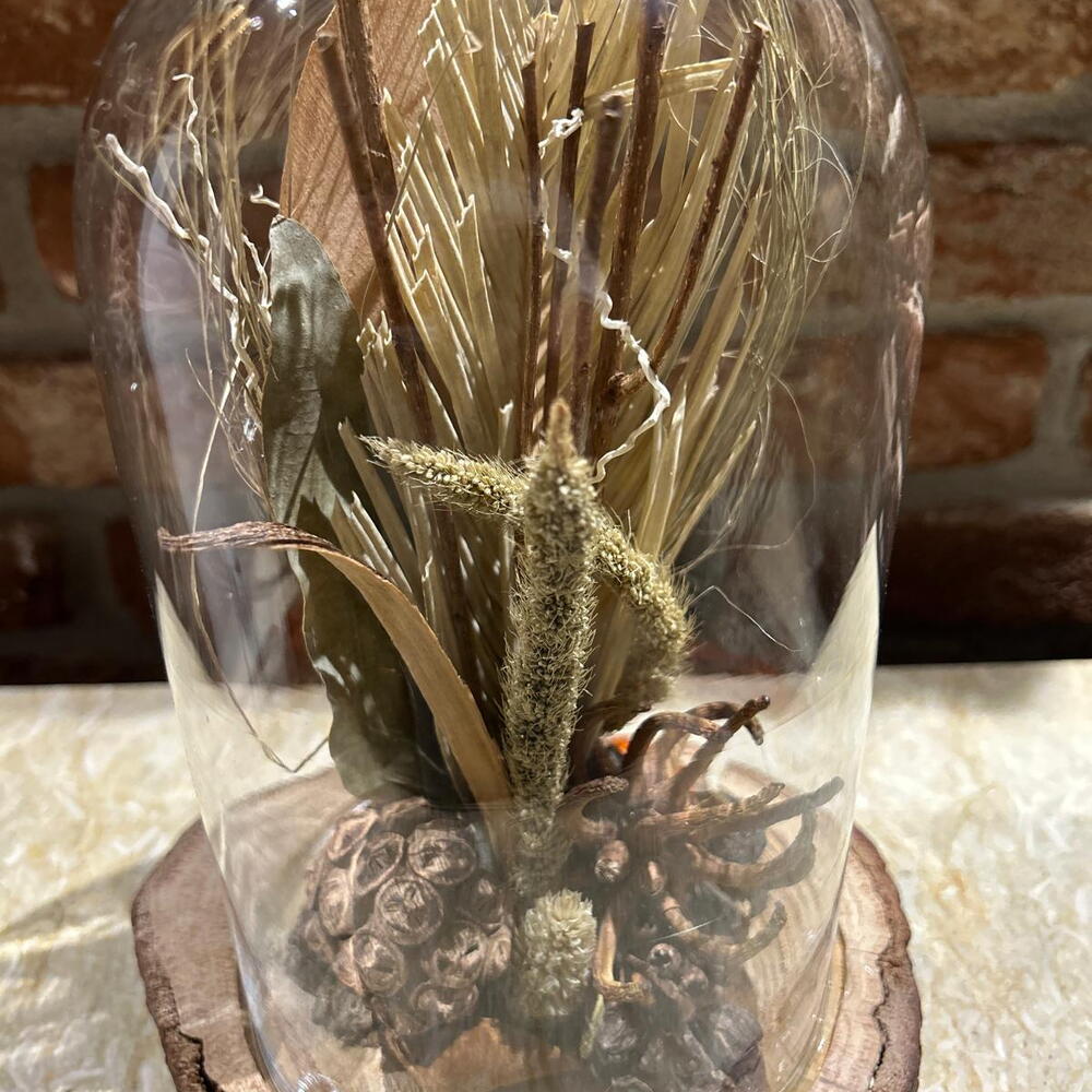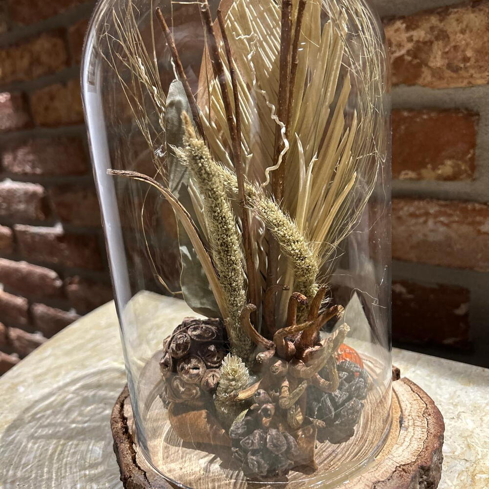 grass - 5 pcs wheat - 2 pcs palm leaf - 1 pcs dried flower - 1 pcs natural dried flowers - 1 pcs glass bell - 1 pcs twigs - 6 pcs wooden stand - 1 pcs