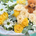 Satin ribbon - 1 pcs Chrysanthemum - 1 pcs Bear - 1 pcs rose - 5 pcs packaging design - 3 pcs gypsophila - 1 pcs decorative greenery - 3 pcs rose spray - 2 pcs