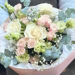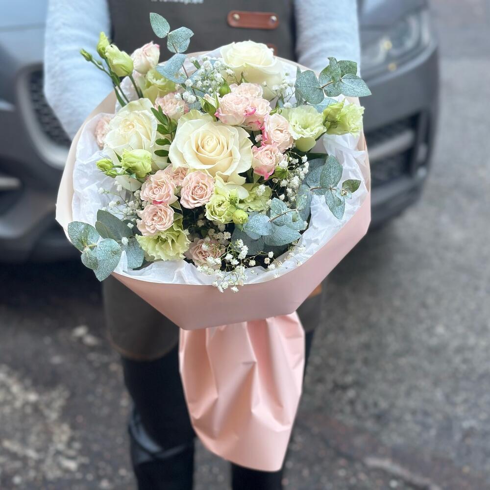 An authors bouquet of eustoma and eucalyptus with the addition of an Ecuadorian rose. A delicate composition combining lush shapes and an exquisite palette. ✅ Add the bouquet and store to your favorites to make it easier to find us 💚