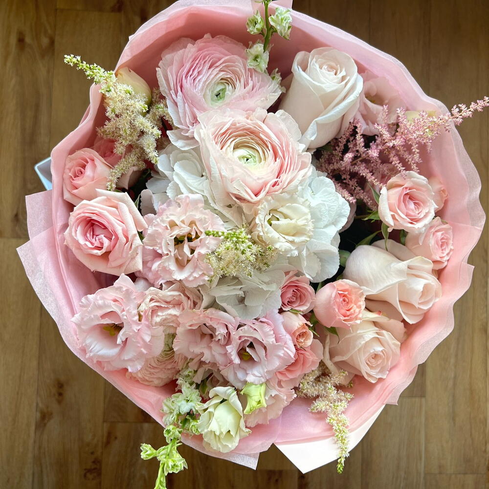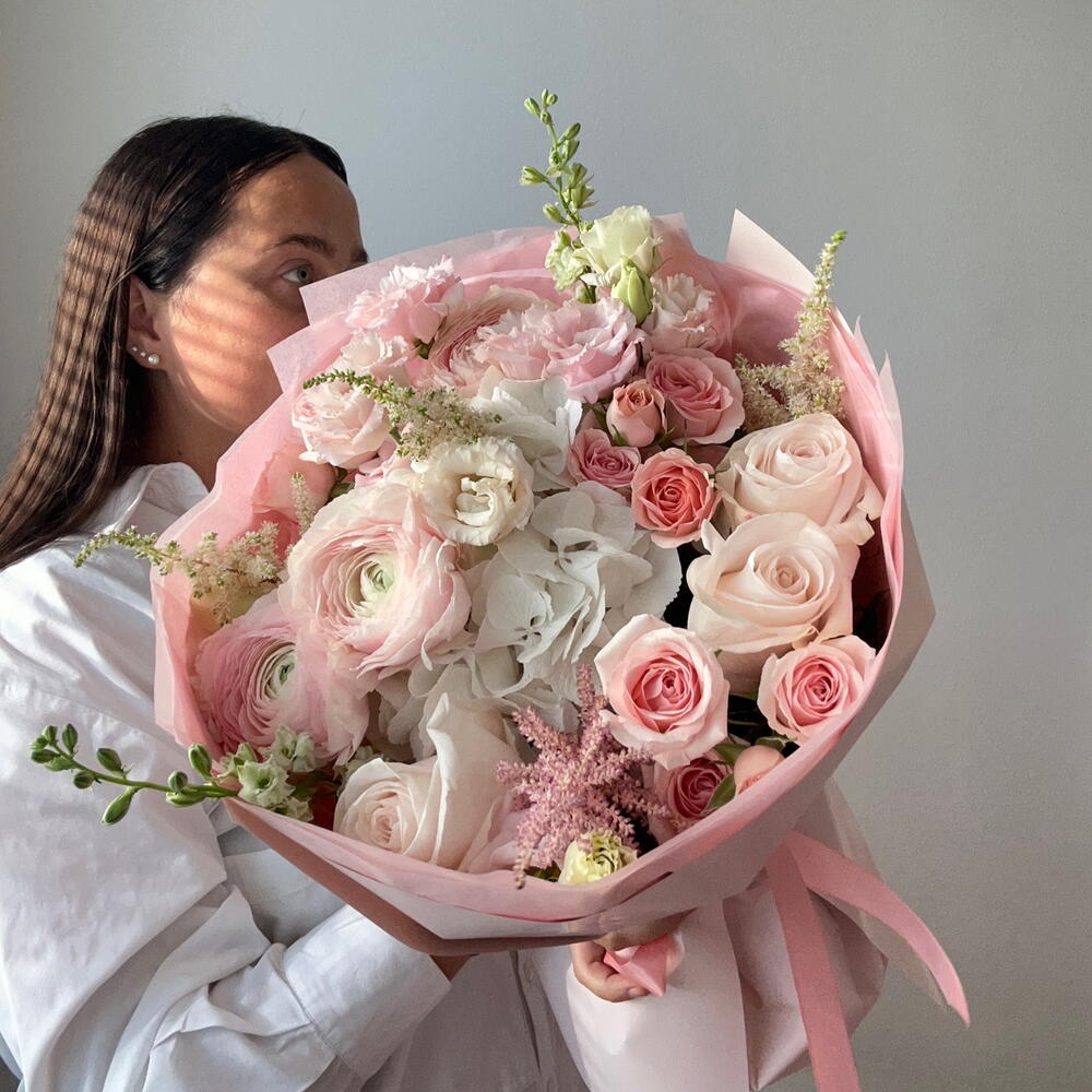 Eustoma - 1 pcs Hydrangea - 1 pcs rose - 3 pcs ranunculus - 3 pcs bush rose - 3 pcs astilbe - 4 pcs