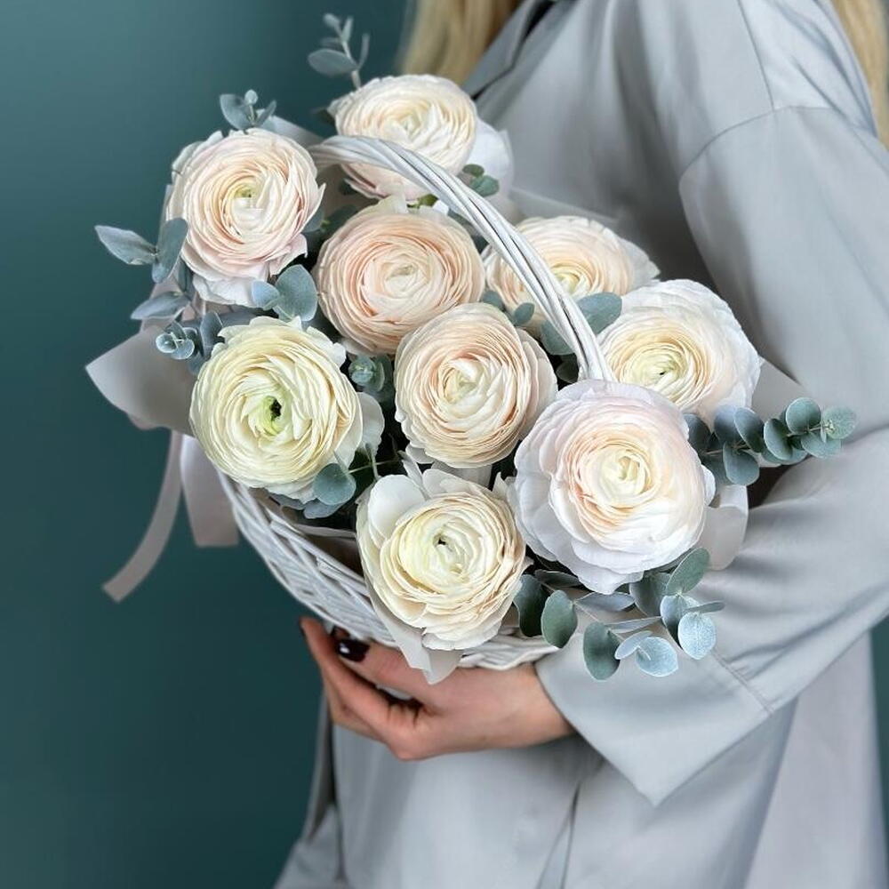 Нежность в корзине – композиция из ранункулюсов и эвкалипта