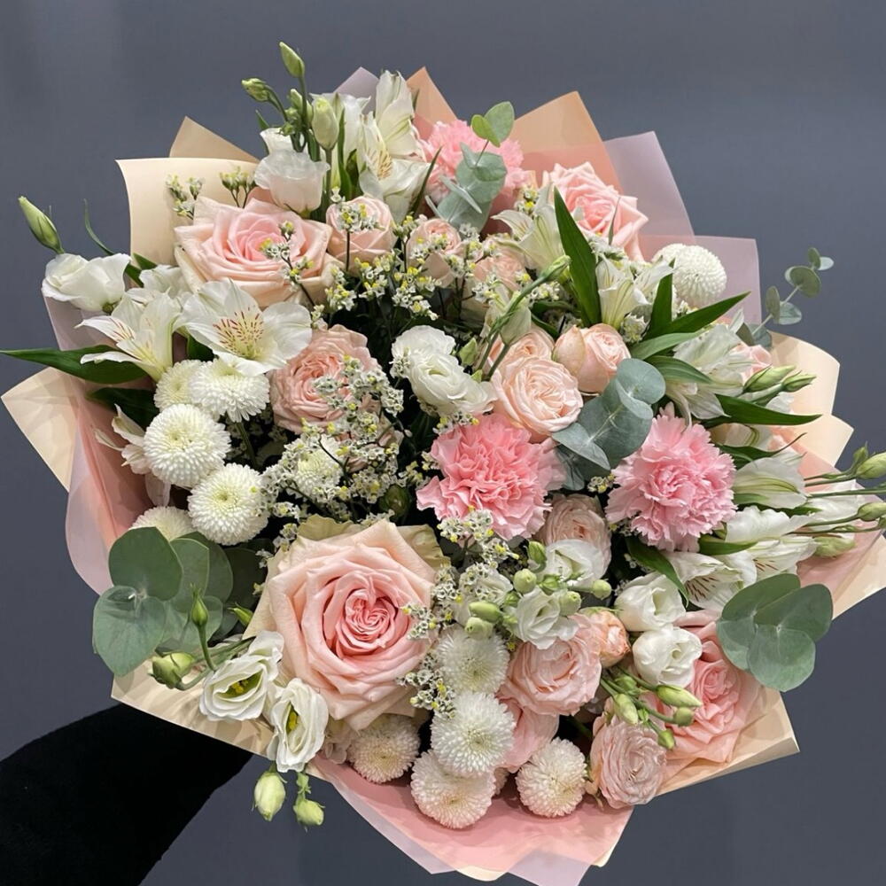Alstroemeria - 5 pcs Eustoma white - 8 pcs dianthus - 5 pcs rose - 6 pcs spray rose - 6 pcs decorative greenery - 7 pcs zartwian - 3 pcs