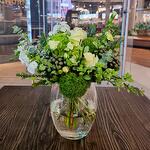 vase glass - 1 pcs barbatus - 2 pcs cosmos - 10 pcs pittosporum - 10 pcs eucalyptus leaves - 3 pcs spray roses white - 3 pcs white roses - 5 pcs europs - 5 pcs kolkol - 2 pcs