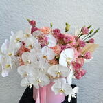 orchid - 4 pcs Pink hydrangea - 15 pcs Lisianthus Alisa white - 10 pcs roses - 25 pcs
