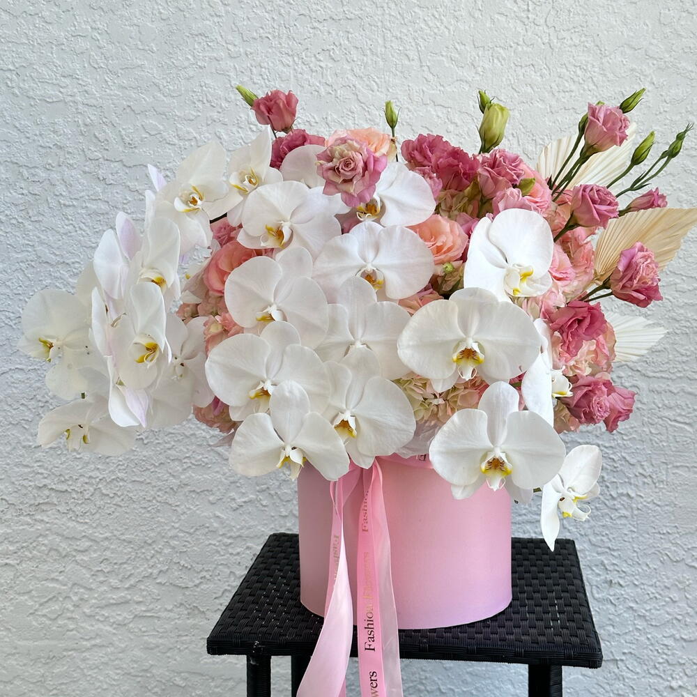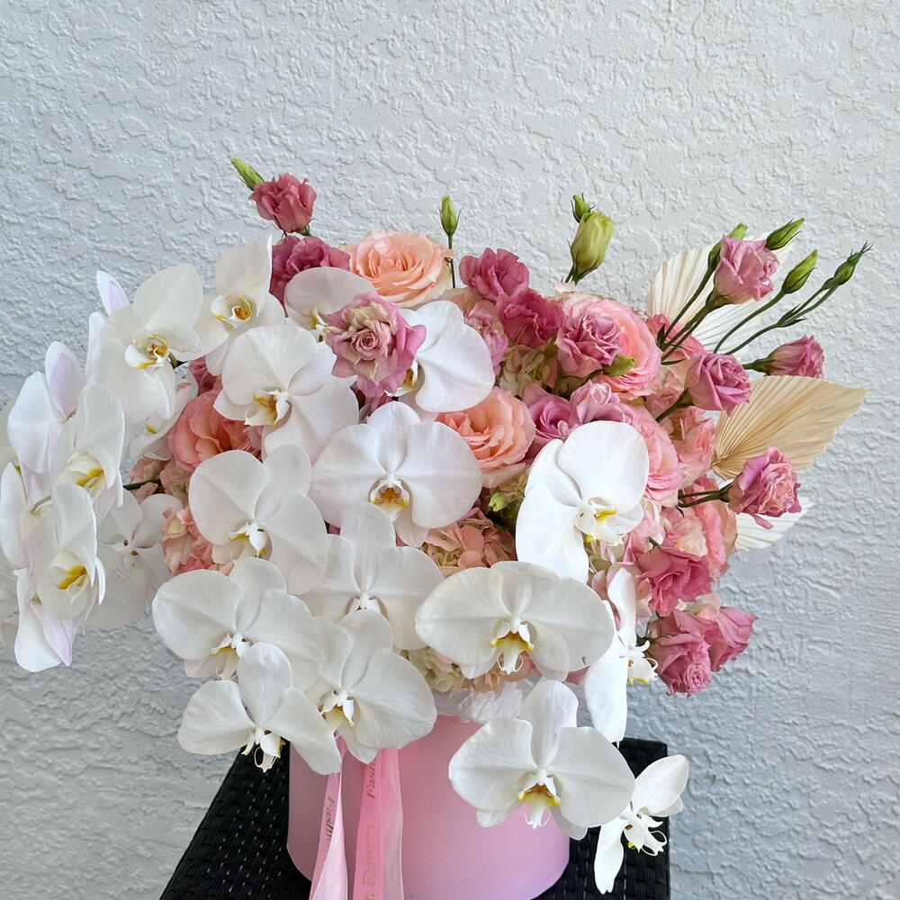 orchid - 4 pcs Pink hydrangea - 15 pcs Lisianthus Alisa white - 10 pcs roses - 25 pcs