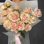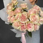 Ribbon - 1 pcs chrysal (powder for prolonging the life of cut flowers) - 1 pcs pink roses - 21 pcs transparent matt wrapping - 4 pcs