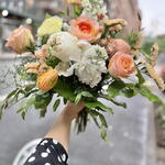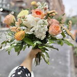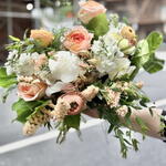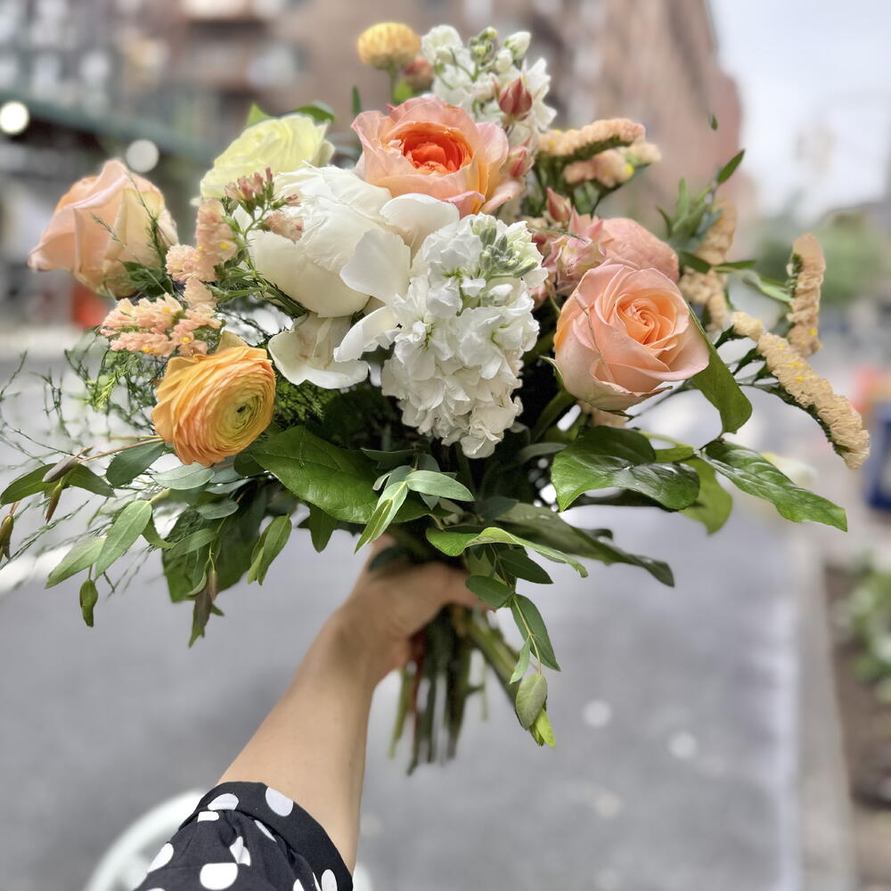 Delicate, dreamy, and full of grace, this bouquet is a romantic blend of creamy whites and warm peach tones. Lush peonies and garden roses take center stage, surrounded by fluttery ranunculus and fragrant stock that add texture and charm.