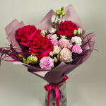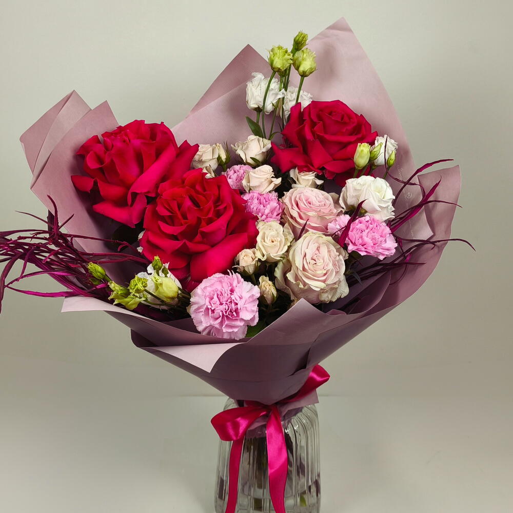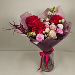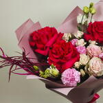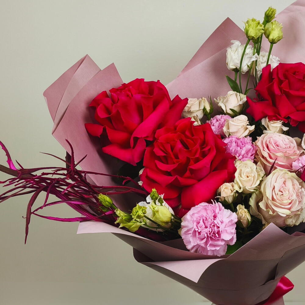 Red rose - 3 pcs Lisianthus - 2 pcs carnations pink - 3 pcs spray rose cream - 2 pcs