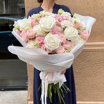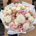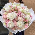 Ribbon - 1 pcs Eustoma - 8 pcs Spray rose - 6 pcs White rose - 14 pcs dianthus - 10 pcs packaging design - 4 pcs chrysanthemum - 4 pcs