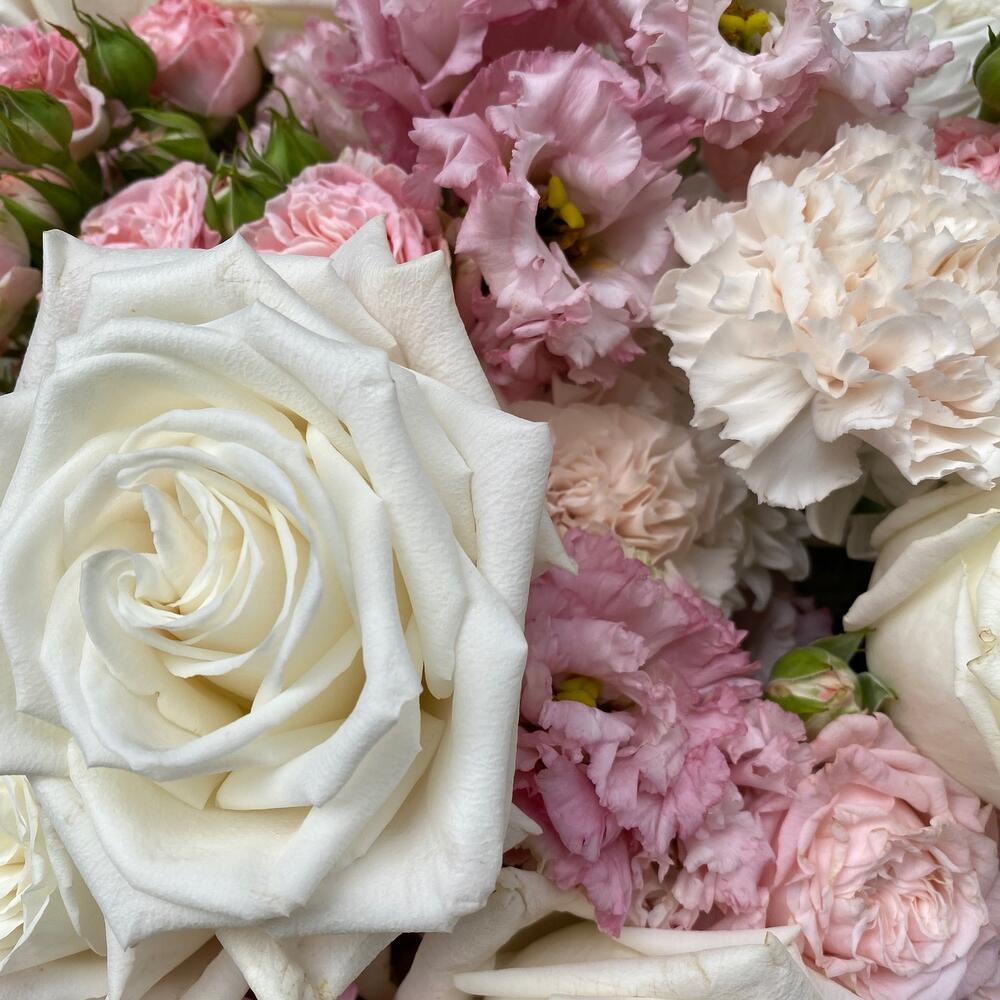 Ribbon - 1 pcs Eustoma - 8 pcs Spray rose - 6 pcs White rose - 14 pcs dianthus - 10 pcs packaging design - 4 pcs chrysanthemum - 4 pcs