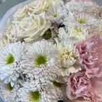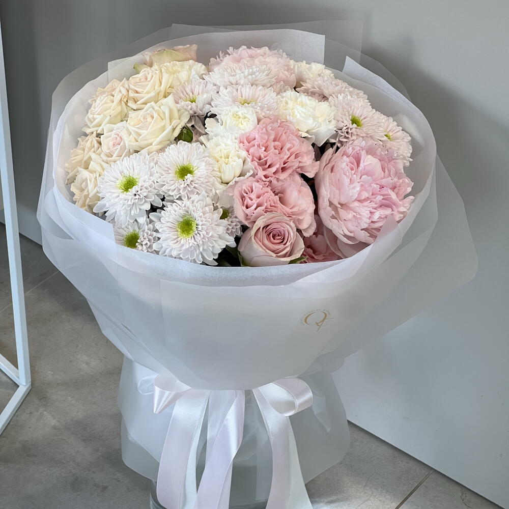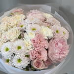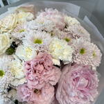 Eustoma - 1 pcs Spray rose - 1 pcs Chrysanthemum - 3 pcs dianthus - 5 pcs wrapping paper - 5 pcs dianthus pink - 2 pcs