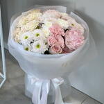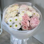 We invite you to take advantage of the special offer from our flower shop. The arrangement consists of 1 Eustoma and 1 spray rose, which are surrounded by 3 chrysanthemums. It is complemented by 5 carnations and 5 wrapping packages. An additional accent is 2 pink carnations. This bouquet is a perfect gift for any occasion.