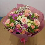 A delicate and romantic bouquet in pastel shades of pink, cream and purple. The arrangement consists of elegant roses, small spray roses, chrysanthemums and delicate baby's breath, which together create a light and very feminine bouquet. The whole is complemented by fresh decorative greenery and an elegant pink floral wrapping. The bouquet is perfect as a gift for a birthday, a name day, Women's Day, Mother's Day or a romantic surprise.