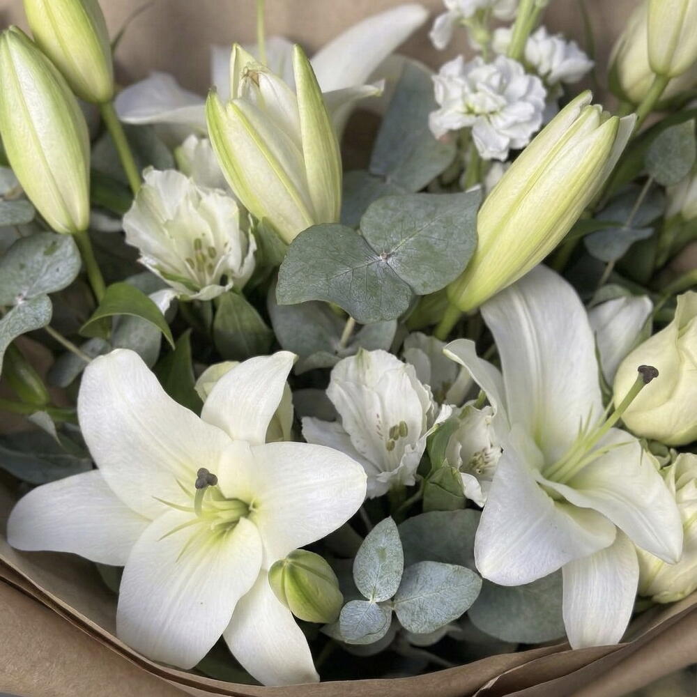 Alstroemeria - 5 pcs White rose - 7 pcs white lily - 3 pcs eucalyptus stems - 5 pcs