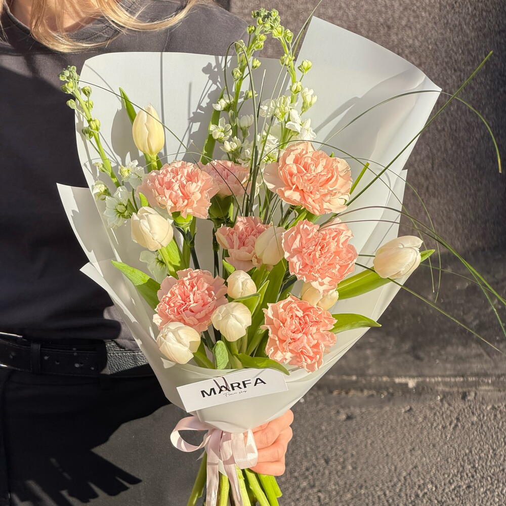 A delicate, airy, light-toned bouquet with tulips and fragrant stock. It won’t leave anyone indifferent.
