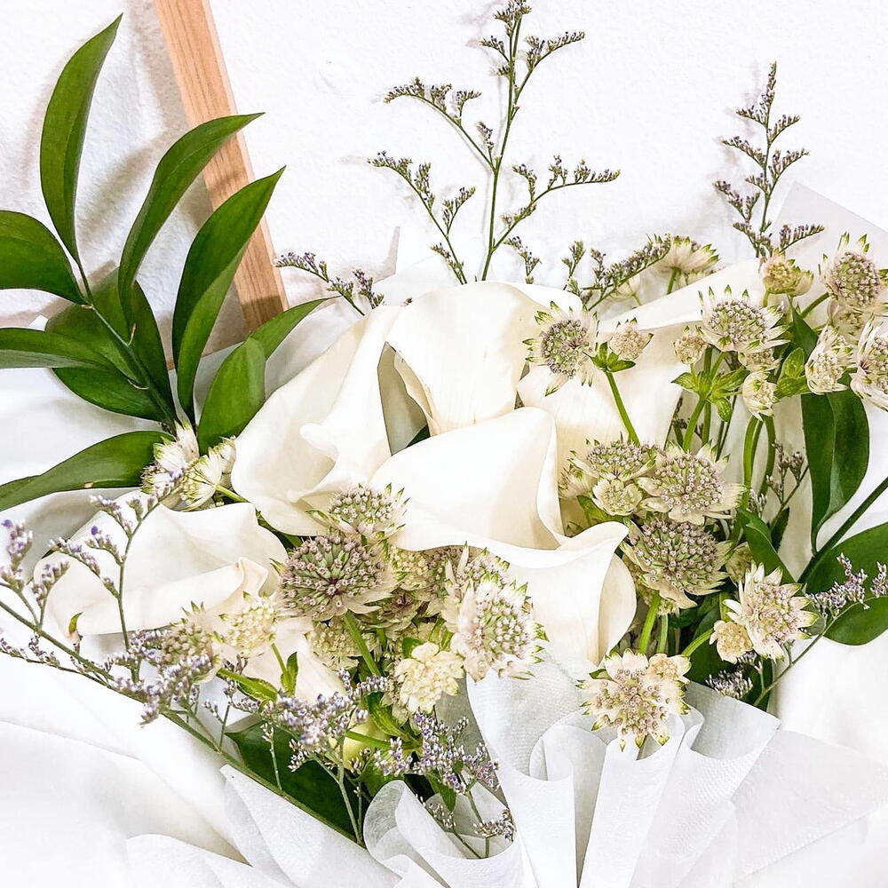 Contains: 5 Calla Lilies, Astrantia, Caspia Ruscus *Do note that bloom size of tulip may vary according to season. Our florist will select the best looking bloom from the floral market each morning. Selection of flowers may also exhibit peculiarities in shade and tone from picture references on this page. That is the beauty of nature! Rest assured that the colour themes and style will remain in accordance with your choice.